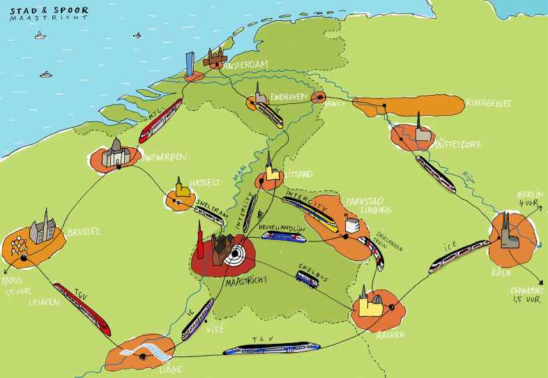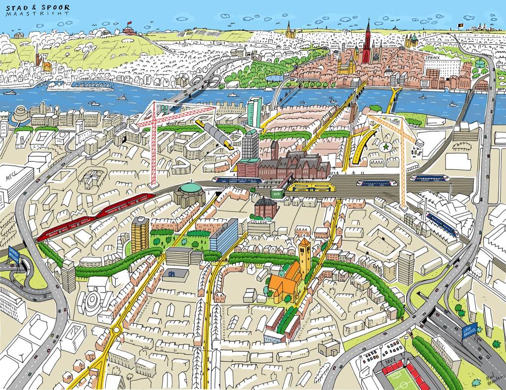 Tekeningen ter ondersteuning van de maatsschappelijke dialoog Over Het Spoor om de volgende grote barrière in Maastricht te slechten en de stad verder aaneen te hechten. De ambitienota is hier in te zien.